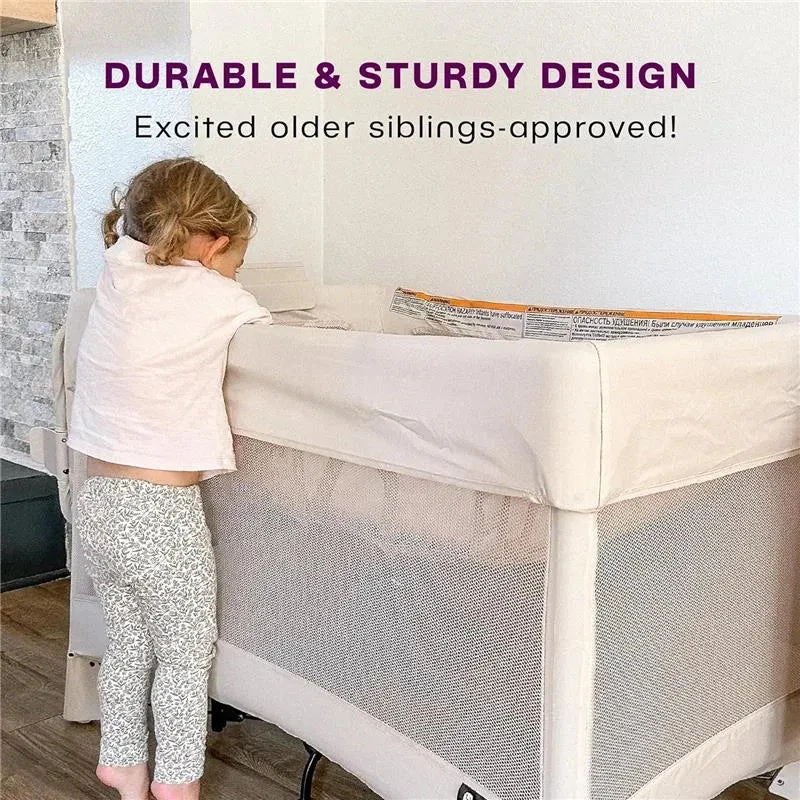 SAFE & DURABLE: The Breeze Plus Playard provides a safe and stable place for baby to rest and play. The sturdy, high-quality design keeps baby off the floor, and the mesh sides allow parents to keep a close eye during naps and playtime.