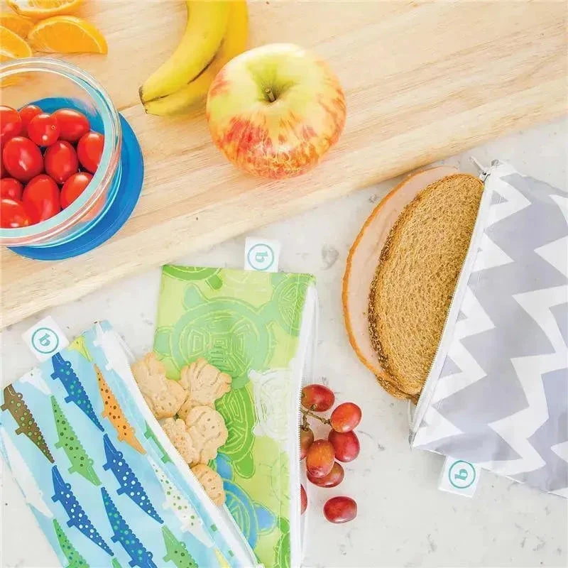 The eco-friendly alternative to single-use plastic baggies, snack bags are made from the same easy-wipe waterproof fabric as Bumkins award-winning SuperBibs. A smooth zipper closure holds crumbs in and single ply construction means no worrying about icky stuff growing between layers of fabric. Great for food or fun, snack bags help organize lunches, toys, electronics and more! Machine washable and dishwasher-safe (top rack) for easy cleaning.