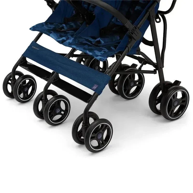 Introducing the Delta Children – BabyGap Classic Side-by-Side Double Stroller, Navy Camo: The most responsibly made lightweight double stroller. Designed for the future in every possible way, all of the stroller’s soft fabric is made of recycled water bottles. Plastic drinking bottles are sorted, cleaned and shredded into flakes that become the yarn the seat fabric is made from. A great choice for your children and the planet, this everyday double stroller is outfitted with front wheels that features precision technology for outstanding control and effortless push, making it easier than ever to glide, turn and maneuver any surface. Incredibly cozy, the stroller has two extra-large extendable canopies, reclining seats and tons of storage. The extra-large storage pockets and removable parent organizer ensure there’s always enough room for your family’s on-the-go essentials. Ideal for travel or everyday use, the stroller’s durable steel frame only weighs 23 pounds and the compact fold, auto lock and carry handle make it easy to transport. Uniquely babyGap, the stroller has leatherette detailing on the handlebars and easily recognized babyGap logos and iconic Brannan Bear on the wheels, canopy, calf rest, parent organizer and safety harness for an elevated look. This double stroller is recommended for infants 9 months up to 35 pounds per seat (70 pounds total).