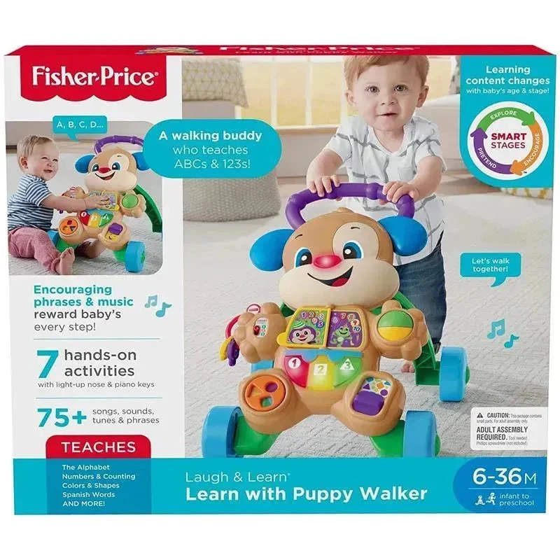 Puppy keeps learning fun going as your baby grows from seated play time to walking here, there, and everywhere! Your baby will love this walker! Exciting hands-on activities keep younger babies busy, while more than 75 songs, sounds, tunes and phrases encourage older babies to get moving, rewarding every step!