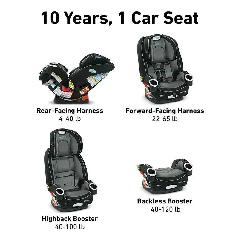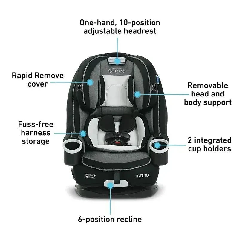 Graco 4Ever DLX 4-in-1 Car Seat gives you 10 years of use with one car seat. It’s the only car seat you’ll ever need! The 4Ever now features a Rapid Remove cover, an integrated belt lock-off for easy installation, and rubberized fuss-free harness storage to help you get baby in and out. It is comfortable for your child and convenient for you as it transitions from a rear-facing harness (4–40 lb) to forward-facing harness (22–65 lb) to highback belt-positioning booster (40–100 lb) to backless belt-positioning booster (40–120 lb). The Simply Safe Adjustâ„¢ Harness System and 10-position headrest lets you adjust the harness and headrest together, with no rethreading. The 6-position recline keeps your child comfortable, while the InRight  LATCH system makes installation easy.