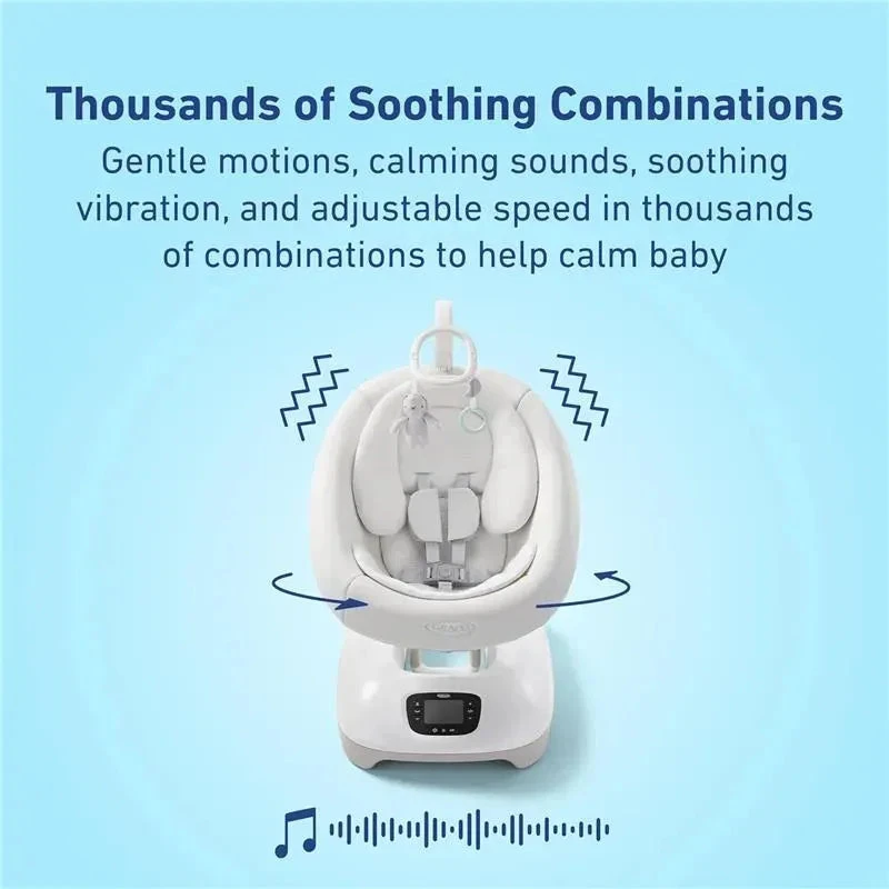 This baby swing offers thousands of combinations of gentle motions, soft vibration, multiple speeds, white noise, and calming music to help create more peaceful, happy moments for you and your baby.