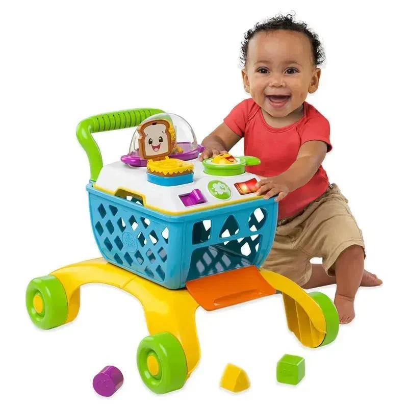 This grow-with-me activity toy gives baby endless hours of playtime fun with a shopping cart just like mom and dad use. The 4-in-1 Shop ‘n cook walker from Bright Starts giggling gourmet collection entertains baby with 4 stages of play: The cook top is removable for sit and play; The cart legs lock in place so the cook top becomes a stationary activity table; when baby begins to toddle, the wide, sturdy legs are perfect for learning to walk – The popcorn pops as baby pushes the cart along! As baby grows, just remove the cook top to reveal a shopping cart that they can load up- just like the carts at the grocery store! The cook top offers lots of developmental activities including cooking sounds that sizzle and popcorn that Pops! Slide the lever and the Silly sandwich pops up. Push the light Up button for sizzling sounds or spin the egg roller. Includes 3 shapes for shape sorting fun. Your little Shopper will love this cart full of fun and giggles that’s sure to become a playtime favorite through the toddler years!