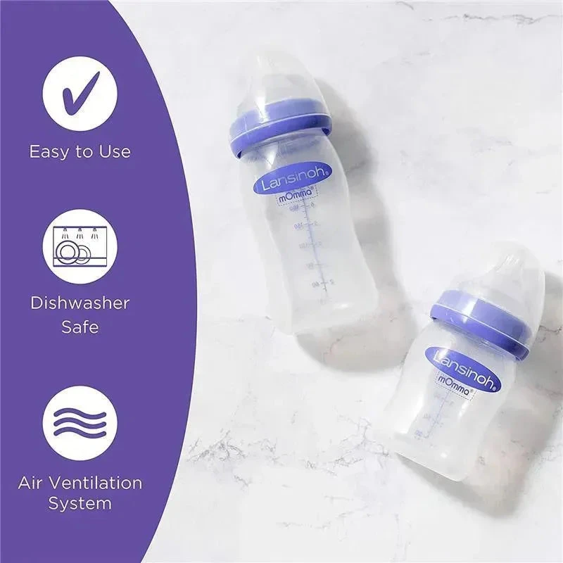 A baby bottle designed specifically for breastfed babies. The Lansinoh momma Bottle with NaturalWave Nipple is clinically proven to reduce nipple confusion. Based on more than 50 years of research, the Lansinoh Bottle with NaturalWave Nipple enables baby to engage in the same natural sucking actions learned at the breast, allowing for a smooth transition from breast to bottle and back again. The Lansinoh bottle is ergonomically designed to encourage the natural oral development of your baby. Lansinoh bottles are anti-colic and feature Lansinoh’s Air Ventilation System (AVS) to reduce intake of gas, a potential cause of colic or spit up. All Lansinoh bottles are BPA and BPS free. Compatible with the Lansinoh Smartpump double electric breast pump, Lansinoh Signature Pro double electric breast pump, the Lansinoh manual pump, and Lansinoh Breastmilk Storage Bottles. The Lansinoh bottles come in two sizes: Lansinoh momma Bottle with NaturalWave Nipple 5 oz and Lansinoh momma Bottle with NaturalWave Nipple 8 oz. Founded by a breastfeeding mom, Lansinoh has been committed to helping moms succeed in breast feeding for over 30 years.