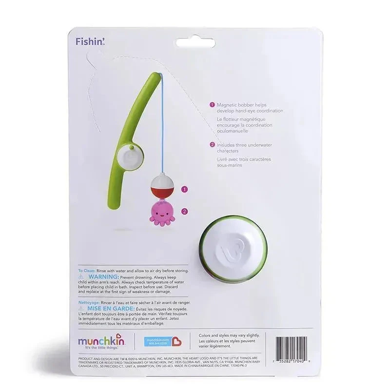 Bath toy set contains (1) magnetic fishing rod and (3) underwater bobbing characters