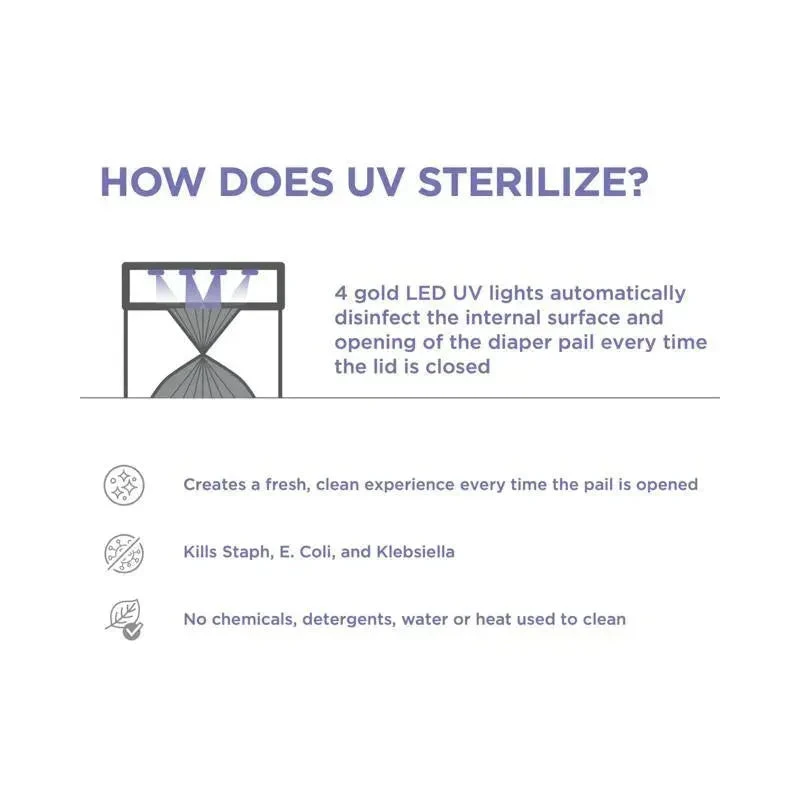 UV sterilization – 4 gold LED UV lights automatically disinfect the internal surface and opening of the diaper pail every time the lid is closed