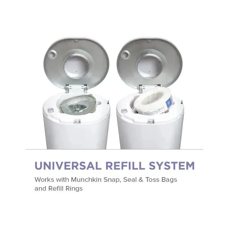 Universal refill system – compatible with all Munchkin-branded refill rings, Snap, Seal & Toss™ bags and Nursery Fresh® refills. Use with Munchkin UV Snap, Seal & Toss™ for best results.