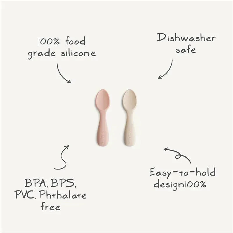 First Step to Self Feeding: Mushie toddler starter spoons are the perfect companion for your little one’s journey into independent feeding. Recommended for little ones ages 12 months and up.