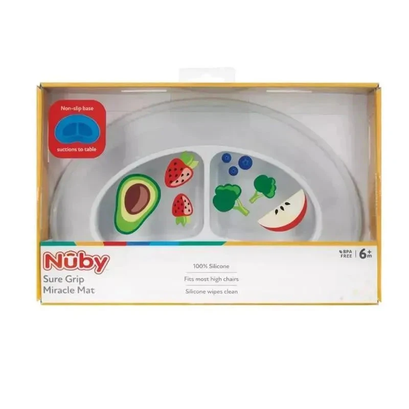 No more dropped plates! Nuby Sure Grip Miracle Mat Section Plate is designed to help busy households have fewer spills and messes. The built-in suction grip creates a seal to the tabletop making self-feeding easier for you and your child. Parents can spend less time worrying about accidentally tipped over bowls or plates, and more time enjoying feeding time with little ones. The Sure Grip Miracle Mat Section Plate’s curved shape easily fits most high chairs. Not only is self-feeding less stressful, cleanup is simple, too. The 100% silicone plate is top rack dishwasher safe, so life is less about cleaning up and more about quality time spent with your family.