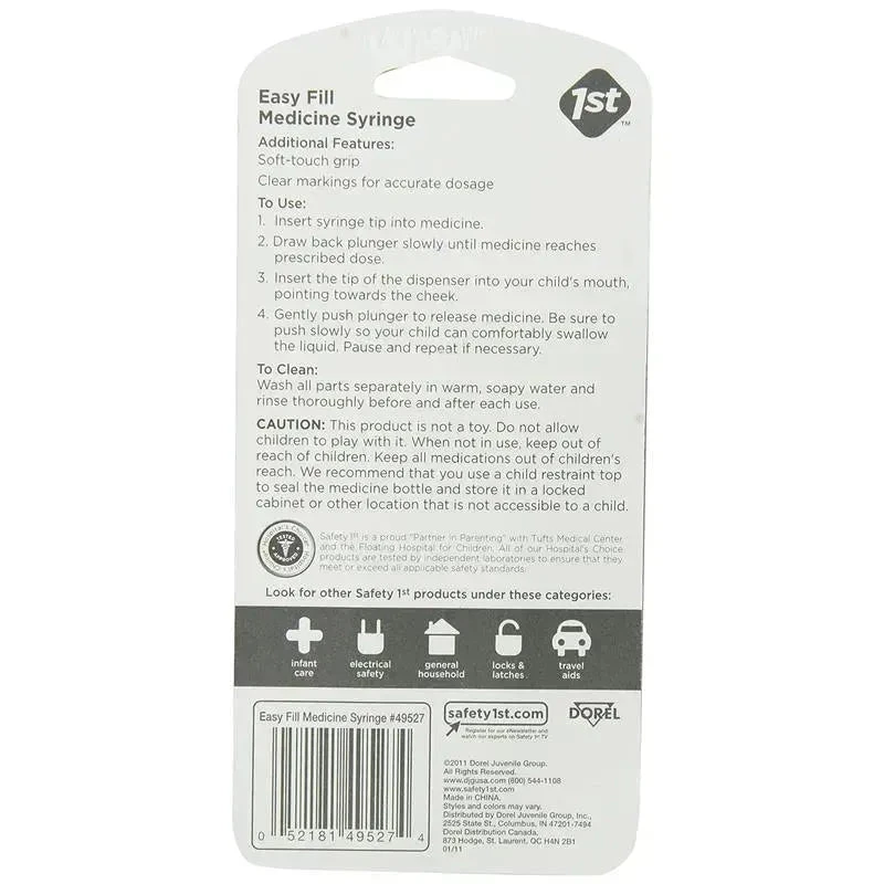 Safety 1st easy fill medicine syringe, soft touch grip provides comfortable dispensing and it’s roll-proof for tabletop convenience.