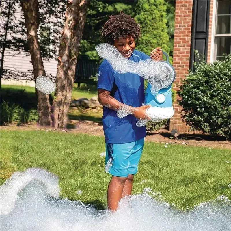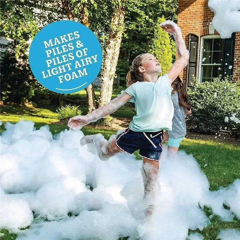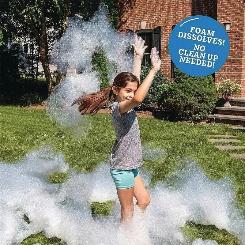 The ultimate foam experience! Instantly turns your backyard or schoolyard into a foam party! Makes piles of light airy foam in minutes that is perfect to run through, jump in, and toss in the air. One fill of the Fömalanche creates enough foam to fill up five pick-up trucks in 25 minutes. Just add the solution and press the button to start. Includes 10 fl. oz. of foam concentrate. Requires six D batteries, not included. Ages: 5+. TO USE: add the non-toxic and tear-free formula foam concentrate solution and water to the reservoir and turn the machine on for fast, easy, foamy fun! Features handle for easy portability and storage. Cleaning up is easy – take out the hose and wash it away or wait for it to disappear on its own within a few hours. Either method is safe for the environment – but for the best lawn care we recommend washing it away. This will not stain clothes.