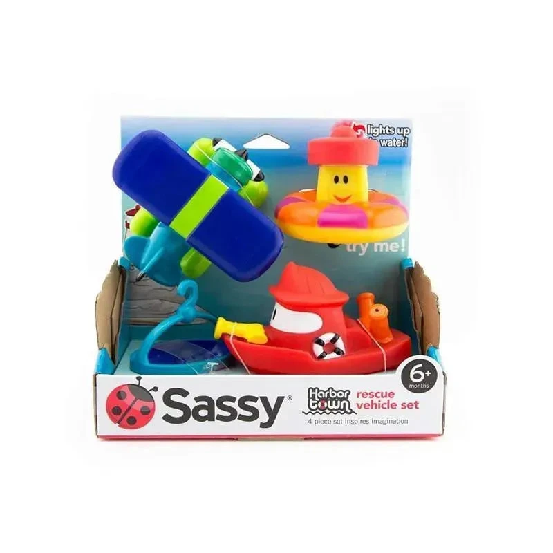 The Sassy Harbor Town Rescue Set makes bath time so much funner with these adorable characters! Each toy does something different. For example the red boat squirts water from three directions, the plane floats in the water and also attaches to the rescue basket, and the buoy lights up when is placed in the water. Great for bath time or even the pool! Â