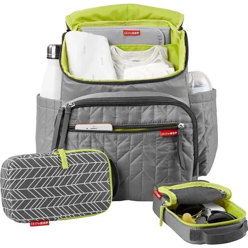 Our lightweight, quilted Skip Hop Forma Gray Diaper Bag Backpack offers hands-free ease and special packing cubes for baby’s gear. The spacious interior fits everything from snacks to spare outfits and the extra wide opening makes it easy to pack and grab essentials in a pinch.
